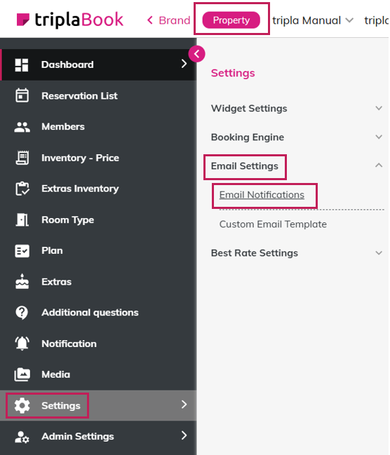 - Action: 'Settings' → 'Booking Engine' → 'Email Settings' → 'Email Notifications'