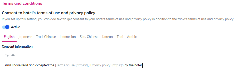 Step 2 | Turn on the [Active] button, a "Consent information" field will appear. |