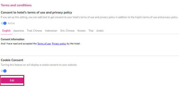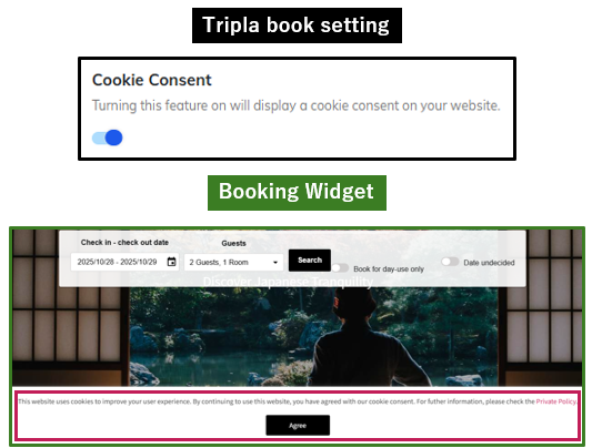 Step 4 | When "Cookie Consent" is turned [ON], a cookie consent message will be displayed on the Booking Widget.