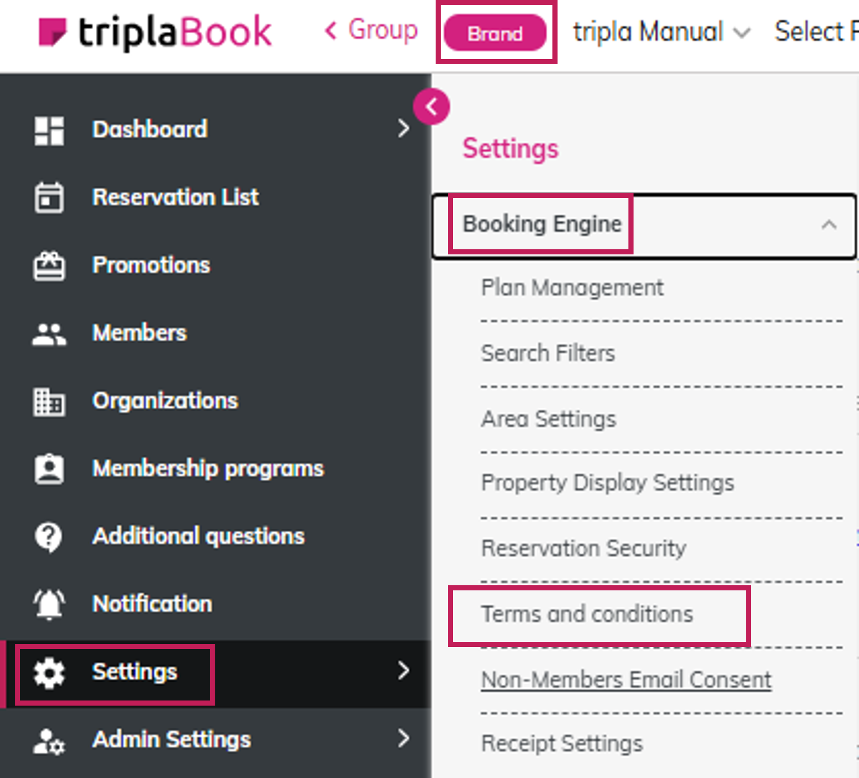 Action: 'Setting' → 'Booking Engine' → 'Terms and conditions'
