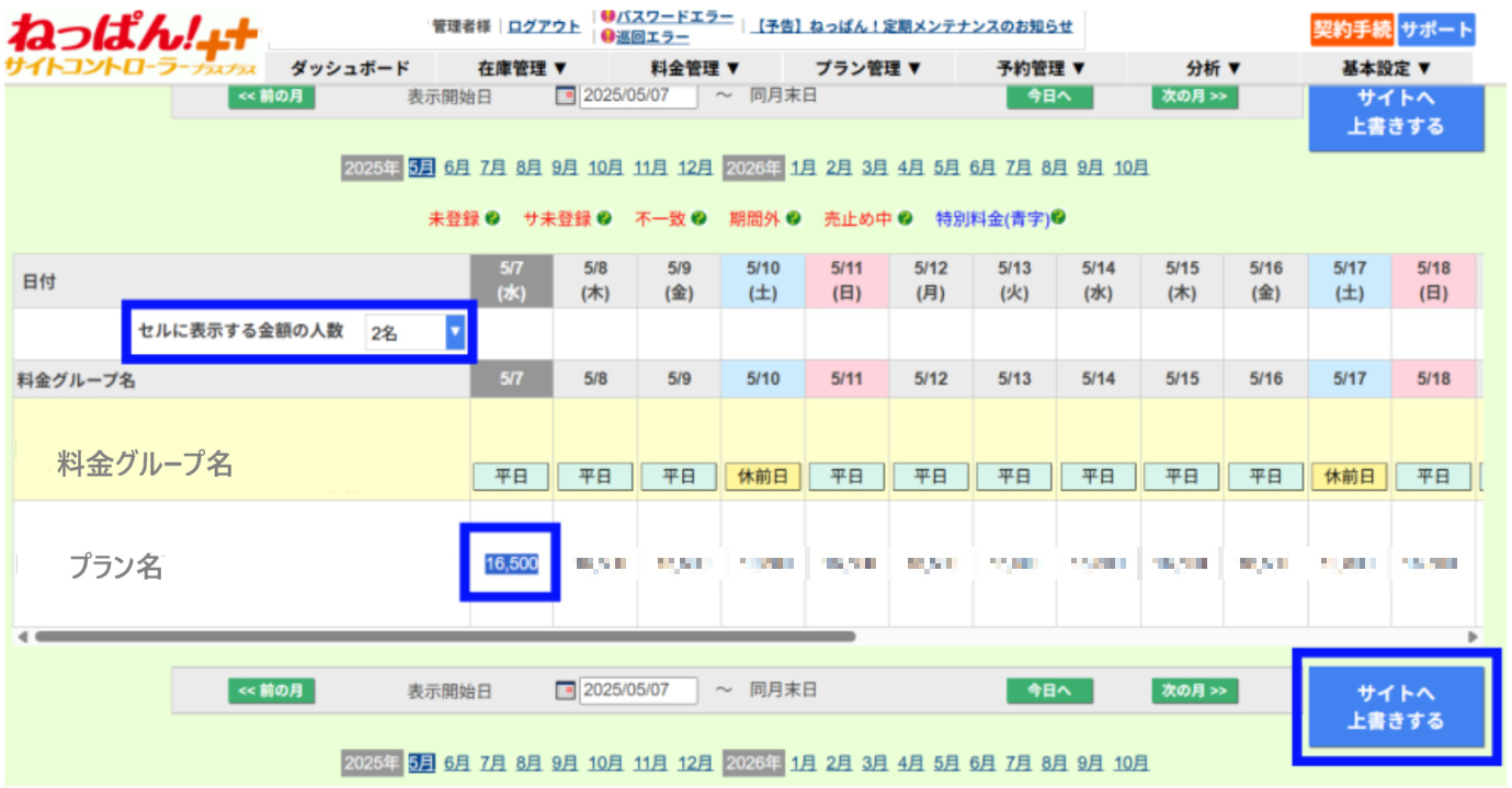 ④ 日別シーズナリティ下の白枠に利用人数毎の料金が表示されるため、この状態で「サイトへ上書きする」ボタンを押下する