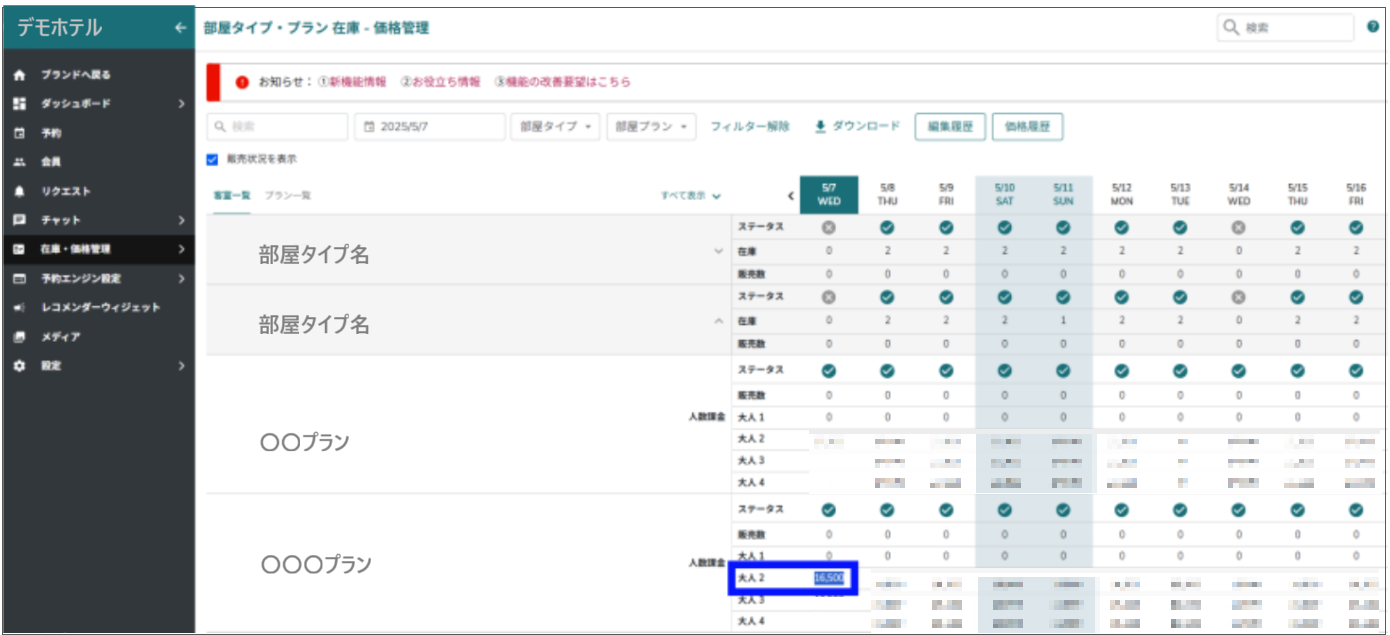 ⇒ 該当の日付の2名料金部分に料金が同期される
