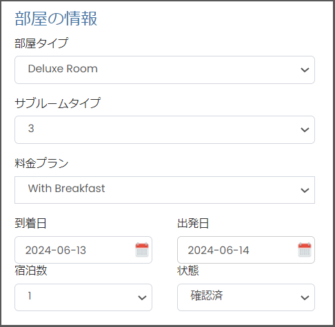 部屋タイプ、サブルームタイプ、料金プラン、宿泊日程、泊数、予約ステータスを選択します。
