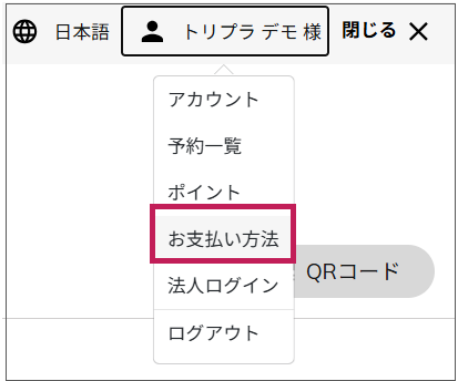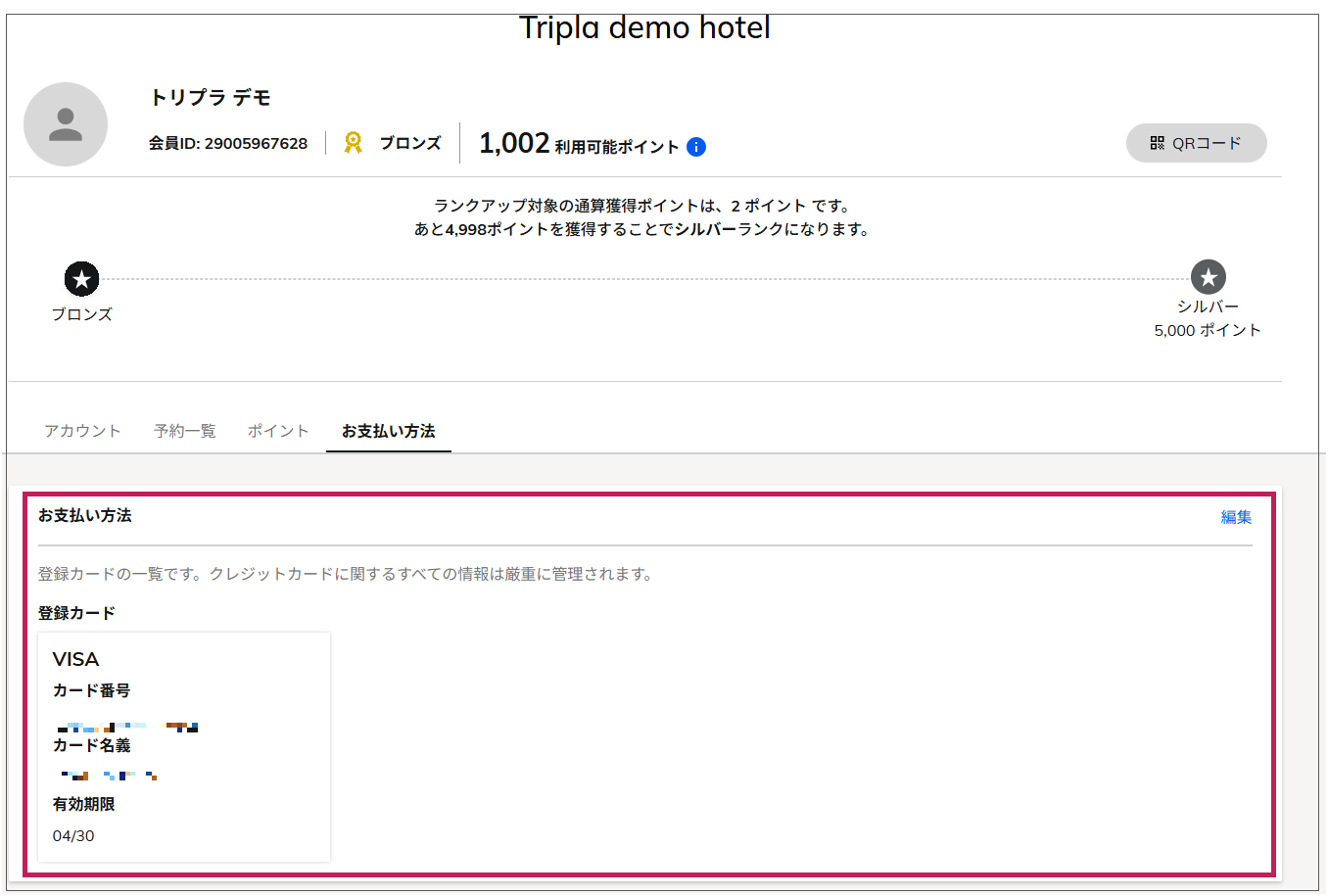 画面左上に会員様が保有している「ポイント数」「会員ランク」、会員プログラムから設定が行われている場合「QRコード」が表示されます。 ※triplaポイントプログラムを設定されていない場合は、表示されません。