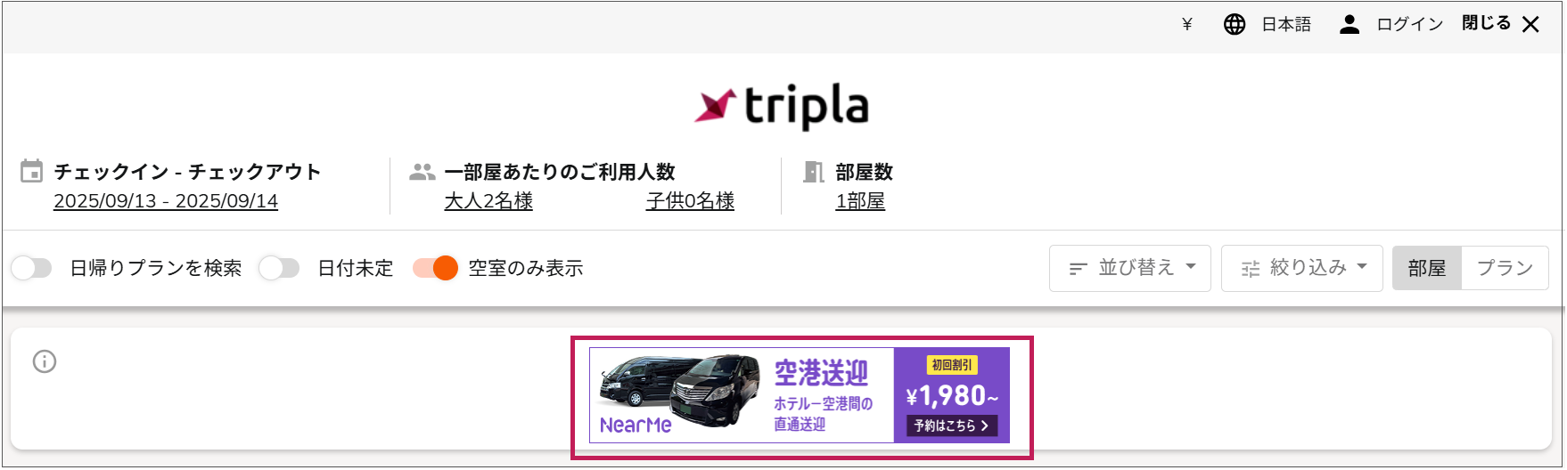 tripla側管理画面で宿泊予約完了時の予約完了メールと予約完了画面に「空港直通サービス」のバナーを掲載することができます。