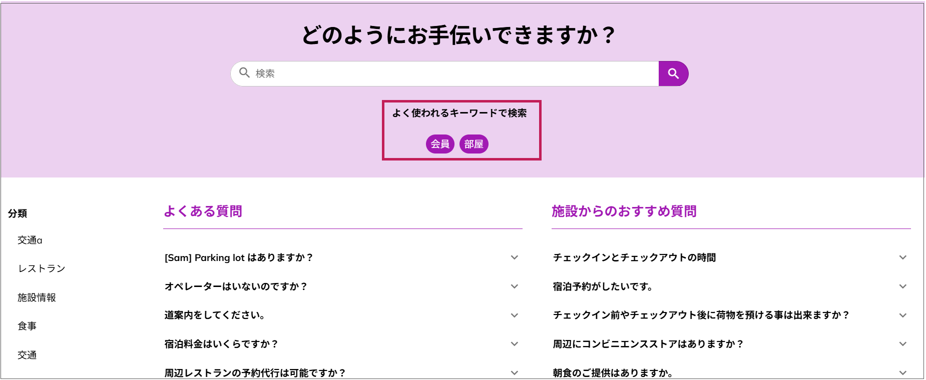 FAQウィジェットを使用すると、チャットボットに登録されたFAQから「よくある質問ページ」を自動生成することが可能です。