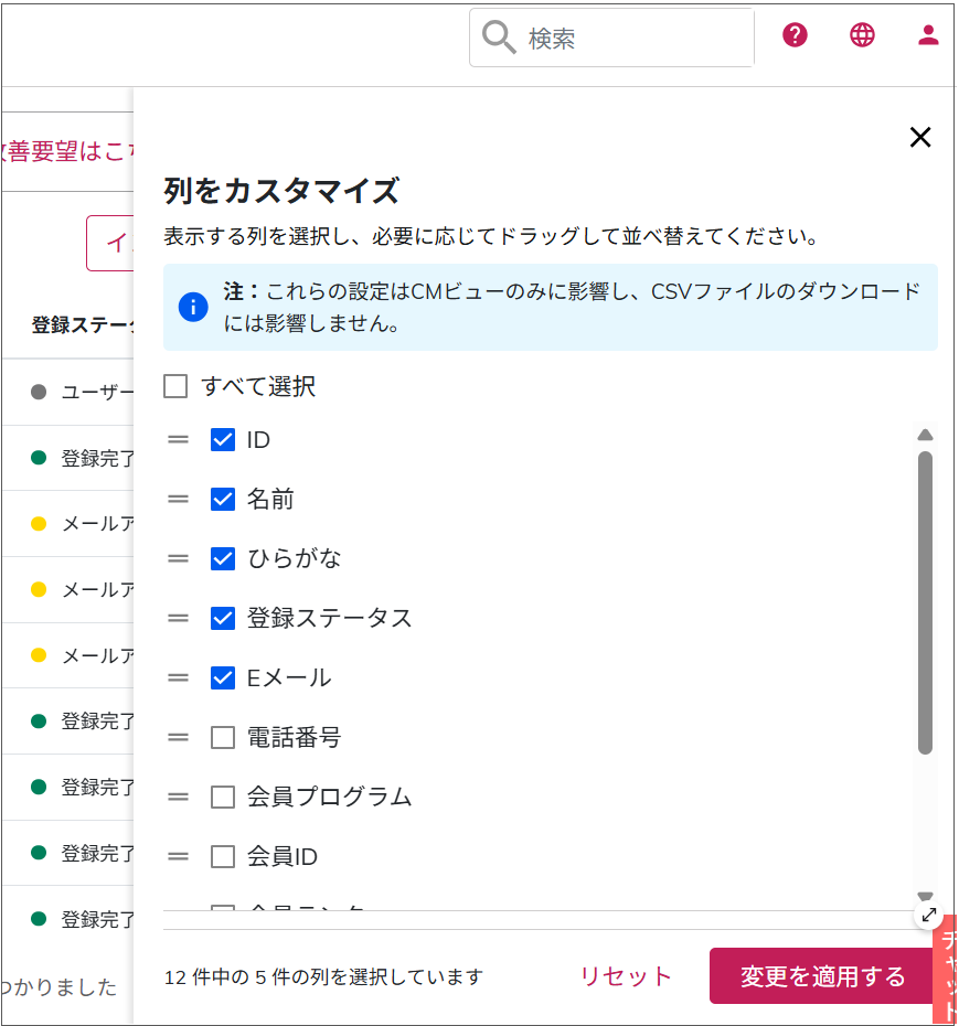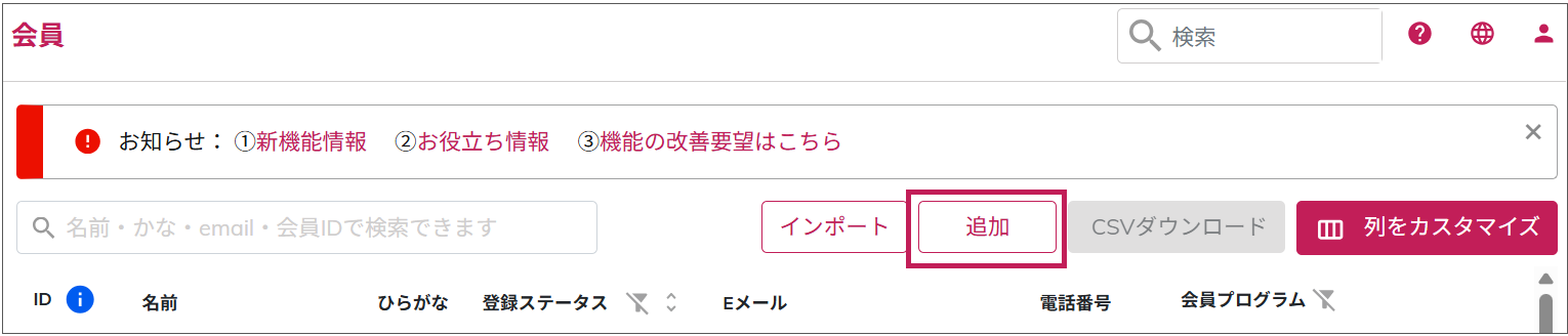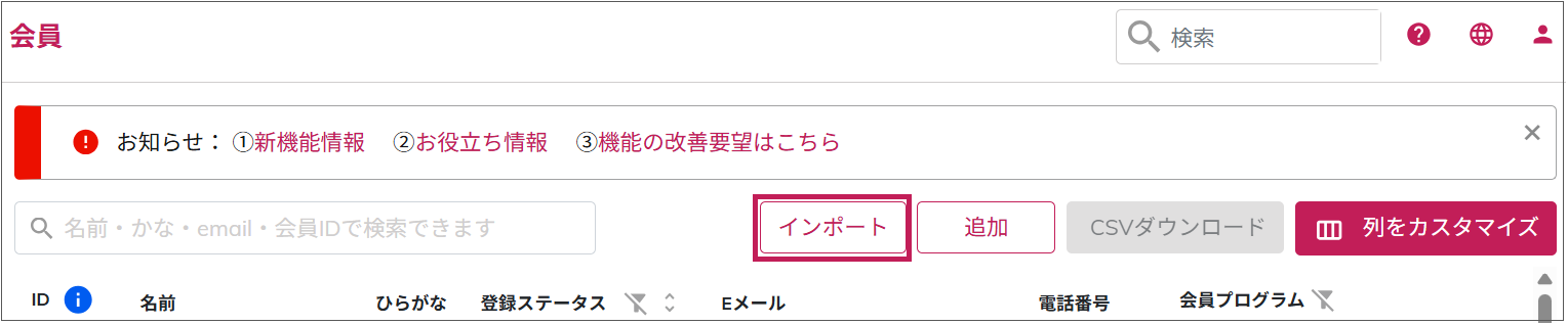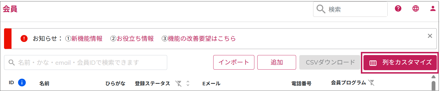 ID、名前、ひらがな、登録ステータス、Eメール、電話番号、会員プログラム、会員ID、会員ランク、メール送信可否、会員登録日時、最終更新日時