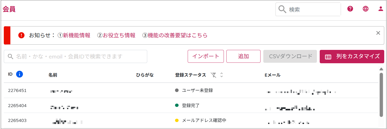 会員情報は会員登録画面でお客様ご自身で登録される以外に、管理画面で個別に追加、またはCSV形式でインポートが可能です。