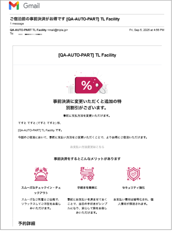 決済方法の変更(現地決済からクレジットカード事前決済に変更)にチェックを入れると、手仕舞い日時と事前決済メールの項目が表示されます。