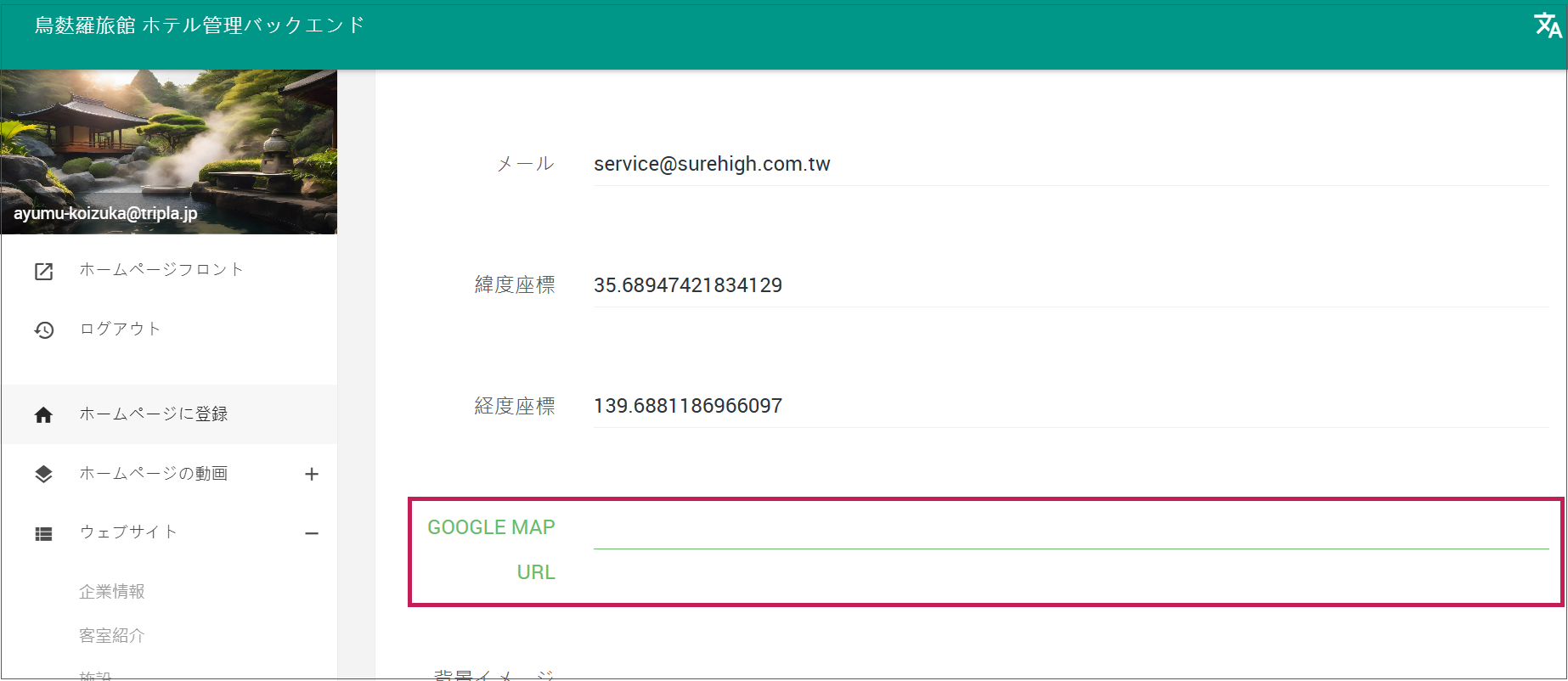 緯度と経度はGoogleマップからホテルの情報を確認後、設定してください。(Googleマップで施設名・住所を入力後、ピンの上で右クリック)。