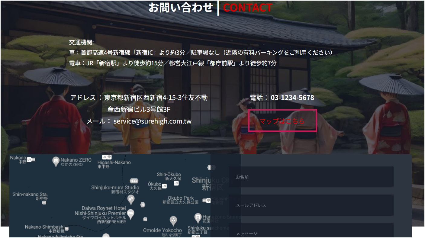 「マップはこちら」をクリックすると施設のgoogle地図ページへ遷移します。