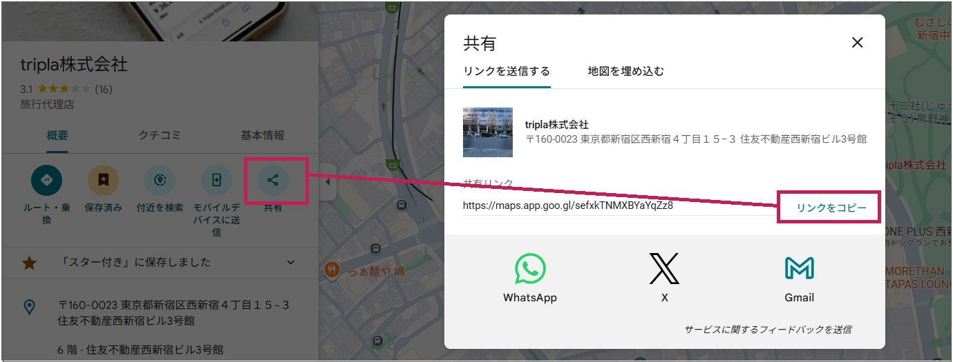Googleマップ上で施設名を検索し、検索結果の「共有」アイコンをクリックする。